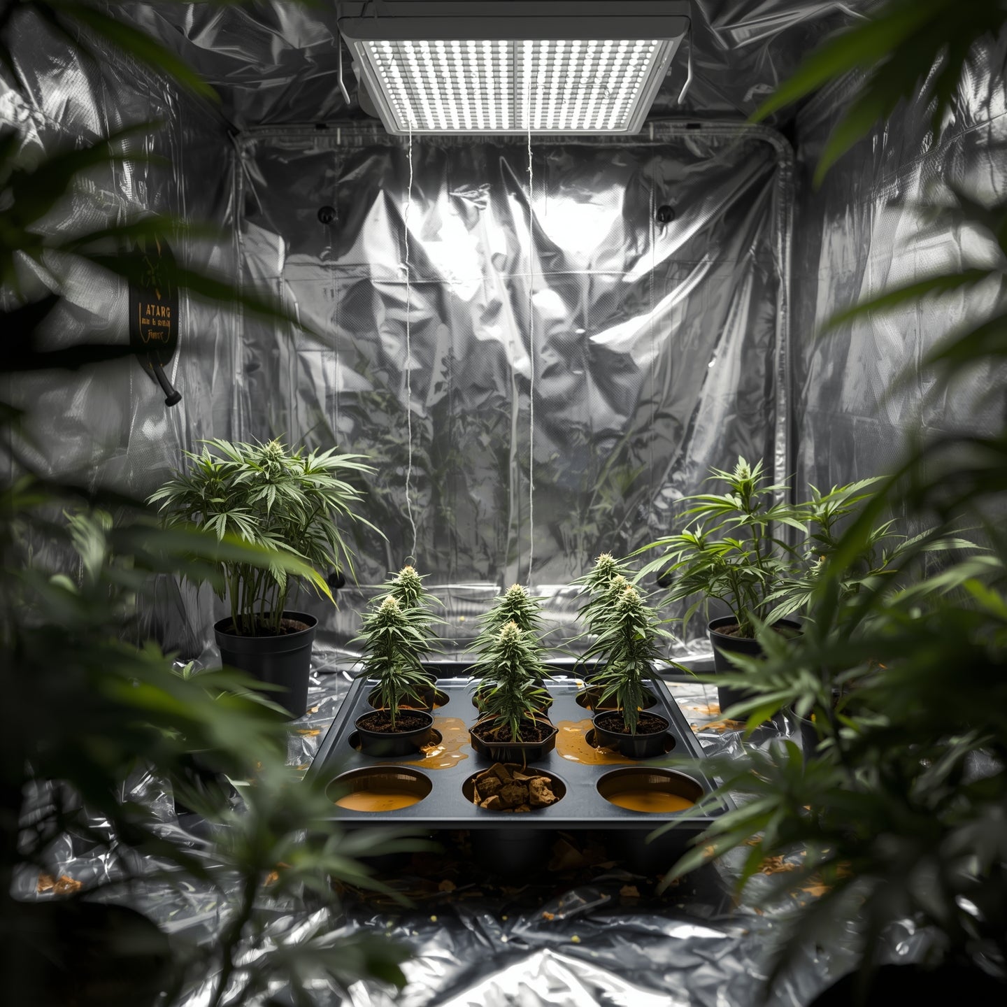 Heavy-duty 1×1 m drip tray designed to collect runoff beneath pots and fabric bags. The rigid surface contains spills and simplifies irrigation management in 1 m² tents or bench setups.