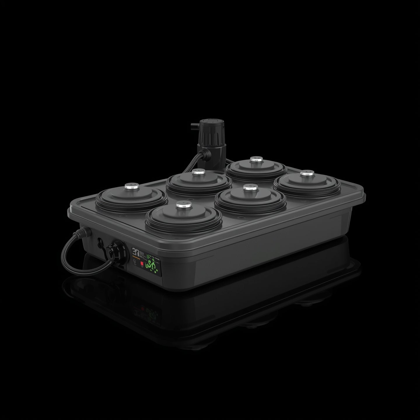 Eight-site Deep Water Culture bundle for larger indoor projects. Balanced aeration to each bucket via a high-output air pump and manifold, with reusable net-pot lids for easy transplanting.