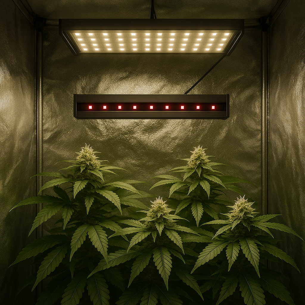 Infrared add-on bar designed to complement full-spectrum fixtures during late veg and flower. Simple mounting beside existing LEDs.